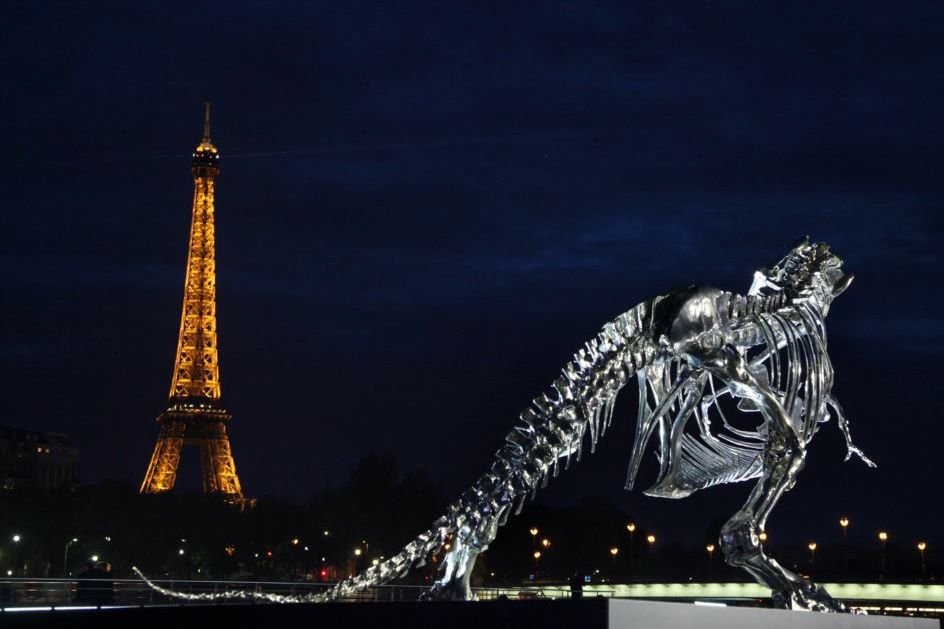 Představte si, že nad fotkami ze své pařížské dovolené nonšalantně utrousíte: „A tohle je Tyranosaurus rex, vyfocený před Eiffelovkou.“ Šílené? Právě za takovým úlovkem se teď ale můžete do Paříže vypravit. Nad řekou Seinou se totiž tyčí Tyranosaurus v životní velikosti. Přesněji řečeno, jeho kostra. Pravěkého dravce, měřícího tři metry na výšku a šest metrů dlouhého, sem nainstaloval francouzský umělec Philippe Pasqua. Socha se skládá z 350 chromových kostí a byla vytvořena podle skutečné kostry Tyranosaura, nalezené v Číně.